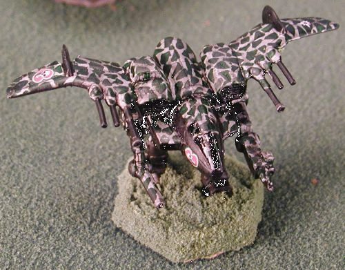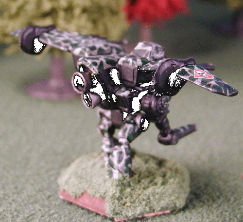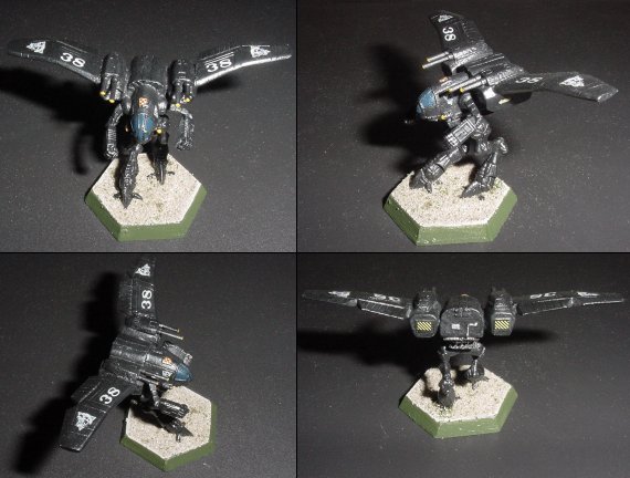 One of the first issues to be addressed was the revamping of the aerodynamic properties of the original Nazgul. The fuselage was elongated and streamlined for better in-flight handling characteristics. Also the external gun pods were eliminated in favor of the more traditional design with the weapons embedded in the wing itself. The original long legs of the Nazgul resulted in a high center of gravity. For better ground handling and stability the legs were shortened. Additional myomer was added to make the transition into flight mode easier. Armor was also increased on the legs to protect this vulnerable part of the LAM. Armament was beefed up as well. The streamlining efforts mandated the removal of the nose guns so a medium laser was added to the arm. A Streak 4 SRM was mounted on top of the nacelle for close engagements. Louvers were installed over the front of the launcher to improve streamlining. This also kept debris out of the launch tubes. The louvers snap open prior to missile launch. It was admittedly a return to dorsal mounted weapons, but it still represented a net, aerodynamic gain over the original gun pods. The wing structure was maintained mostly intact with the exception of embedding the main weaponry in the wing root. One problem that plagued the original Nazgul however, was poor lateral control when airborne. The improved streamlining of the new design greatly exacerbated the problem. As a result rudder fins were added to the ventral side of the wings at their midpoint. This small addition rectified the last of the instability issues. Finally, two issues that had plagued all LAM designs were addressed. The first issue was storage on a DropShip. Because of the wings, a LAM could take up as much as double the space normally used by a BattleMech of its class. This often resulted in a LAM being disassembled for transit and reassembled at the destination; a very time consuming process. The designers easily remedied this problem by adopting the idea of folding wings. Since the wings were set high up on the fuselage and well towards the back of the LAM, it was an easy matter hinge the wings just outside the rudders and have them drop down for storage and transport. The second issue was damage to the wings during combat. Even the most ardent LAM pilot would curse the machine and all its designers once one or both wings became damaged to badly for the ‘Mech to fly. Ground handling abilities were often severely impaired and many times the LAM became a sitting duck for enemy machines. The designers at Novelty Iron Works again came up with a simple but very effective solution. They added explosive bolts to the wing main spars. If either wing became damaged the pilot could jettison both wings and function like a regular ‘Mech. Originally the bolts were added to the folding hinge structure, but this proved to make the structure unnecessarily complex. It also weakened the over all strength of the hinge. The next suggestion was at the wing root, but that approach stripped the Nazgul of the majority of its weapons suite. The designers settled on a location between the wing root lasers and the rudders. This configuration proved ideal. Once the bolts were blown the majority of the wing structure was discarded and yet the ‘Mech retained all of its weapons and its lethal capability. When the new design was “rolled out” of the hanger for the first time; it bore only a moderate resemblance to the original progenitor. There was some discussion of coming up with a completely new name for the design, such as the Uruk-hai. This talk was short lived however. All those who were involved in the work on the new LAM agreed that the project owed much of its success to the ground breaking advances made by the designers of the first Nazul. They also agreed that the LAM was to far removed from the original for it to carry the simple designation of Nazgul 2. So to honor its heritage and yet denote its extensive evolution, they dubbed the revolutionary and exciting new design the Nazgul Mk XIV.