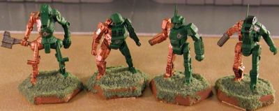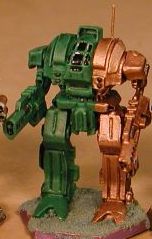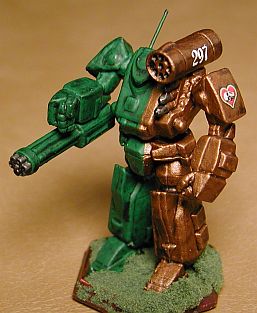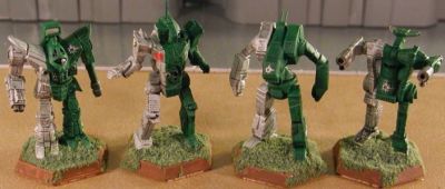 It has been an absolutely amazing journey for the Irish Dragoons. It started off with the idea to do a really great paint scheme using green as the main color in a 2/3 and 1/3 approach. I came up with a lance of oldies that I tried the now famous green and gold combination on. I thought it worked very well. I had just been listening to the Chad Mitchell Trio’s version of the folk song Fyve-I-O, and that’s where the name Irish Dragoons came from. I had a sheet of decals that had some plain, red hearts which I used on the miniatures for the love of Fyve–I. I posted them in 2003 and thought that was it. I’d done my split color scheme. What I didn’t expect was the overwhelmingly positive response the lance received. I thought, “Well, why not do another lance of classics in silver to go with them.” This was a good idea except for a little twist of thought that became a major mind warp. That twist was that I couldn’t have just two lances; I needed to round it up to the next full contingent size, a company. That trend in thinking (i.e. round up to the next complete unit) was either my downfall or my road to fame and glory. ![]() I would definitely have to have a battalion of Irish Dragoons. Now I had the color scheme, the beginnings of unit history, a marvelous unit insignia to tie it all together, and most importantly the adulation of my peers. Yes a battalion would be great. But . . . But what about some vehicles? I had come up with a great idea for a vehicle color scheme and every ‘Mech unit should have some vehicle support. Okay, I can’t fit the vehicles into a battalion, so . . . So let’s go for a regiment. Wow!! Two Battlemech battalions and a vehicle battalion? A full regiment, wonderful! At this point I should have sought professional help. The symptoms were obvious if anyone looked, but I hid my compulsion very well. The Second Battalion, complete with captured Clan ‘Mechs, came online (i.e. I finished painting and posted it) in December of 2004. 2004 was a banner year for the Irish Dragoons. I had even added an air wing, and I thought I was pretty much done. Well except for the infantry and battle armor. Here was where another warning sign popped up. The Clan Moonraker, previously my pride and joy, had become merely an adjunct to the Irish Dragoons history. They were the providers of the captured Clan ‘Mechs that showed up in the Dragoons’ ranks. One issue I had with “captured” Clan Battlemechs in the Irish Dragoons was how to identify them. In most cases captured ’Mechs are just painted in the owning unit’s colors, but I wanted something a little more distinctive. Again I was saved by an old, Irish folk song. It is called The Black Velvet Band. When Clans take a captured Mechwarrior into their personal service they place a Bondsman chord around that person’s wrist. When the captured person completes the necessary training and indoctrination, the chord is cut and the person becomes an official member of the Clan. The Irish Dragoons don’t use bondsman chords on personnel, but I decided that they would use the Black Velvet Band to mark captured Battlemechs as a sign of respect for the Clan’s traditions. As such, each Clan ’Mech has a black band painted on the designation color portion of the miniature (i.e. the unit’s color, not the green side) and whenever possible the Dragoons’ insignia is located in the middle of the band. Saved by a song. On top of all this. the entire justification for the Gorgon Binary was as a specialized unit organized to contend with the Irish Dragoons.