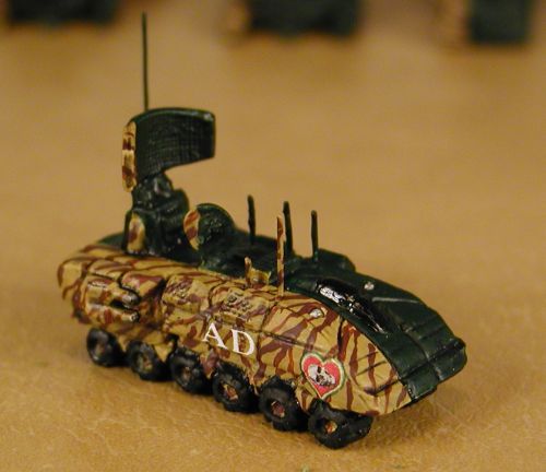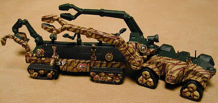 P.P.S. And I was right, it isn't over yet. Inrepose had posted a picture of a missile launcher that I thought would be great in the Third Regiment, so I went to the GZG web site to check it out. Not only did I find the launcher, but a couple of other vehicles that would be great to add to the recovery portion of the Regiment. People of the "Classical Battletech" persuasion turned their noses up at the idea. There was no way that a 15mm could fit into the 6mm world of Battletech. You guessed it. I'd been caught by the old bugaboo, someone said it couldn't be done, so I was determined to show them it could be done. Here are the miniatures I had become enthralled with: ![]() On April 18, 2012 I posted the following to Lords of the Battlefield site: "Irish Dragoons – 11th Recovery Company or Who’s Afraid of 15mm? (Click on the picture below to see a detailed story about each unit.) I pulled my other four flatbed transports to combine with the Phalanx and Oppie lances to form the 998th Recovery Command. I added a lance of Centipede hover scout craft to fill the vacancy and as a result I had to reorganized the entire 9th Battalion. I have always liked the Sloth battle armor but never had a good place to utilize some. However, since I was expanding the Third Regiment to include a basically unarmed, recovery compay, I decided to add a Sloth lance as a security contingent for that lance.
